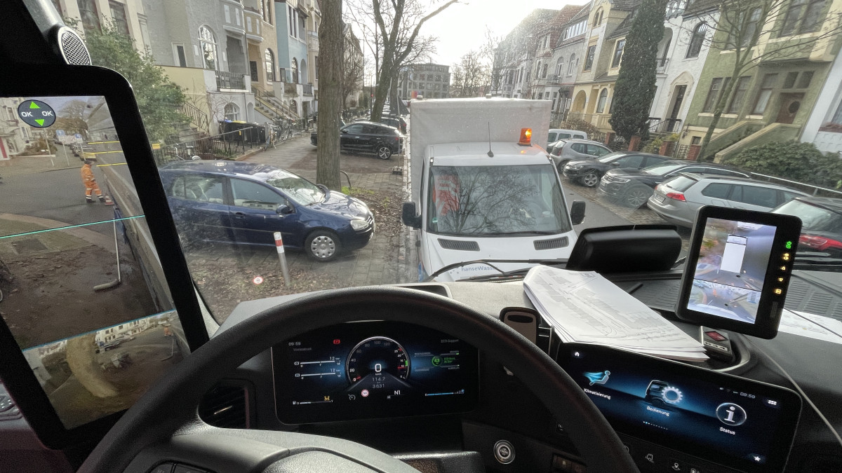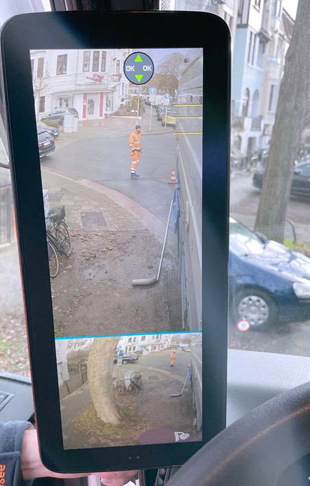 Eine Besonderheit: Der Spülwagen hat keine Außenspiegel mehr. Stattdessen digitale „Innenspiegel“