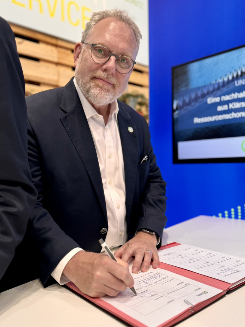 Ekkehart Siering unterschreibt die Mitgliedschaft von hanseWasser bei der „Initiative Sauberer Phosphor 2029” auf der IFAT 2024.