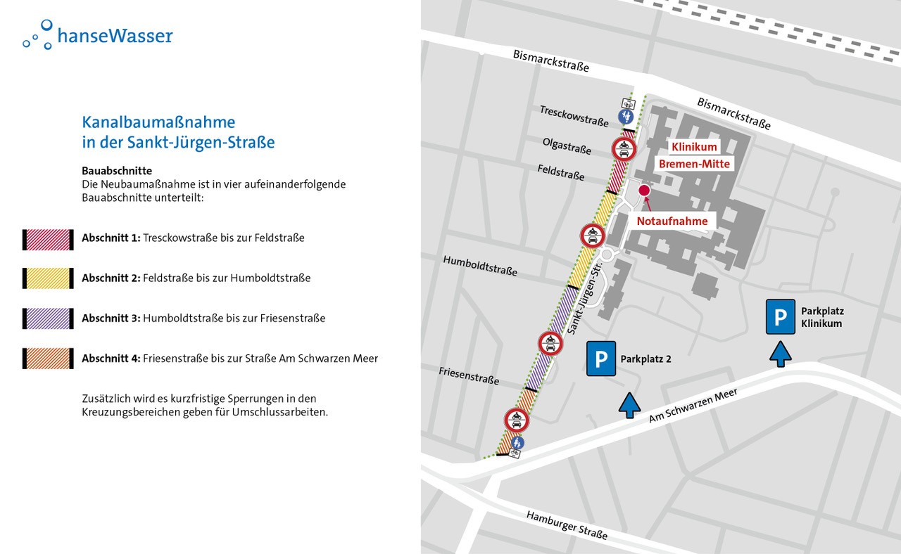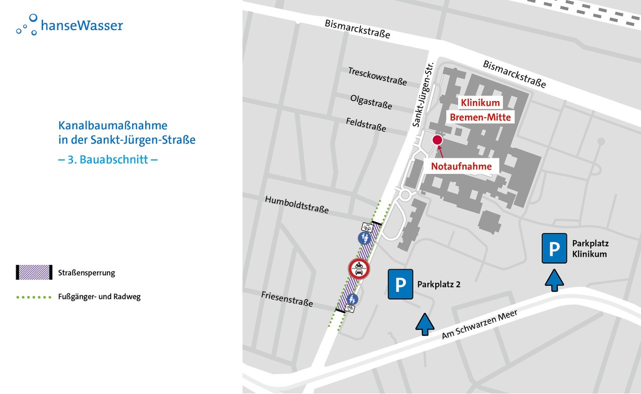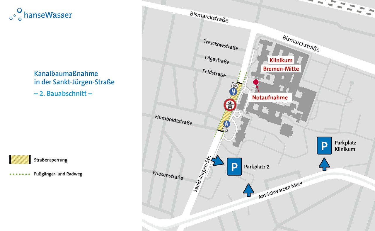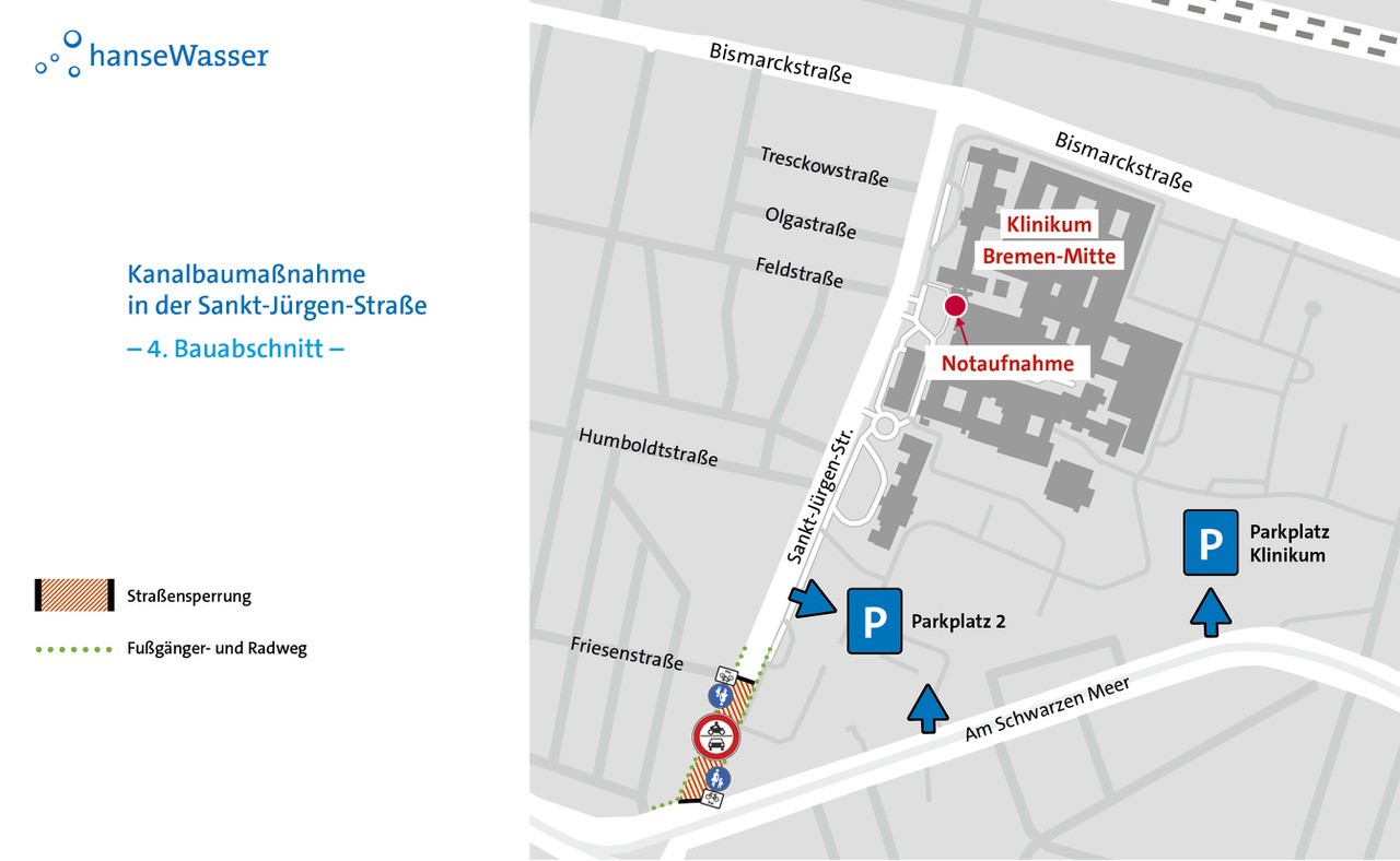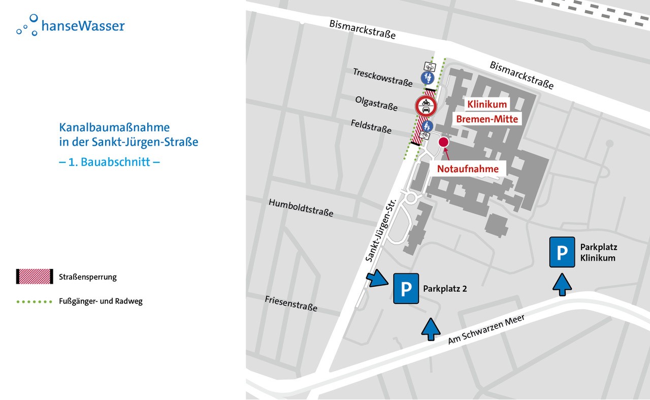 Die Sankt-Jürgen-Straße muss für die Dauer der Arbeiten abschnittsweise voll gesperrt werden, die Anfahrt zur Notaufnahme des Klinikums Bremen Mitte ist jederzeit uneingeschränkt gewährleistet. Der Fuß- und Radverkehr kann die Baustelle dauerhaft passieren. Für den motorisierten Verkehr ist eine Umleitungsempfehlung eingerichtet, die über Bismarckstraße, Bennigsenstraße, Georg-Bitter-Straße, Osterdeich und Lüneburger Str. führt. Zudem werden die Anwohner*innen vor Beginn der Maßnahme durch ein Informationsschreiben über die Arbeiten informiert.